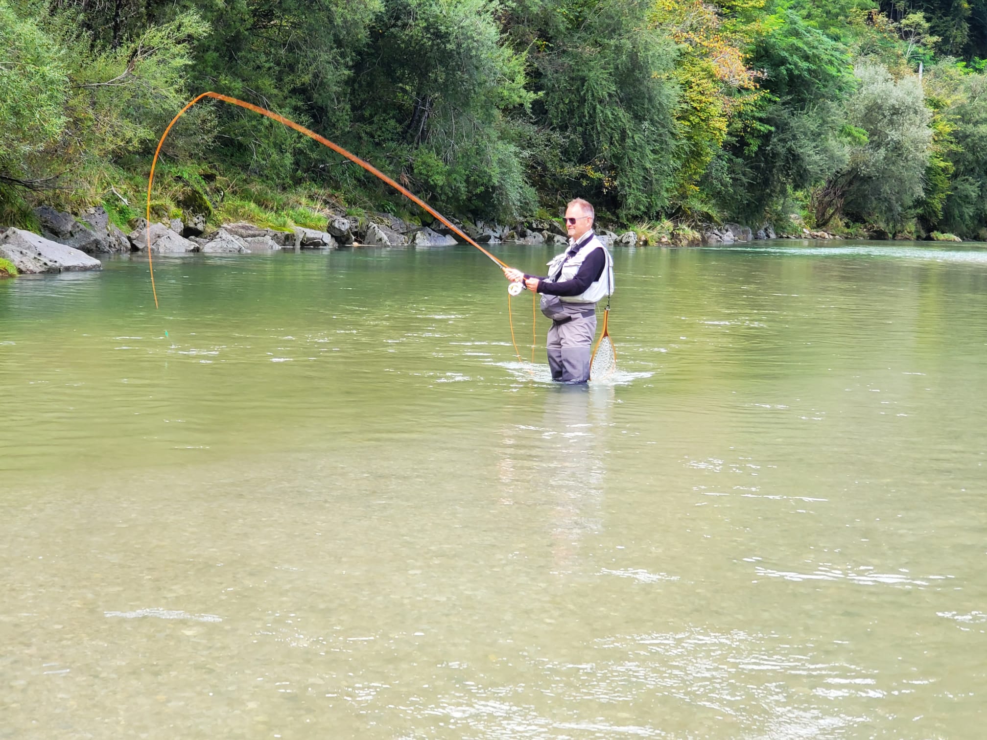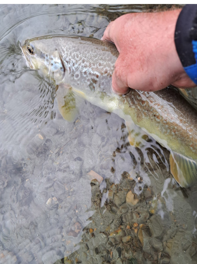 Der Fluss führt zwar nach wie vor ordentlich Wasser, doch wir konnten etliche mittelgroße Forellen überlisten – beste Voraussetzungen für einen spannenden Angeltag.Einen besonderen Moment hatte Martin: Er fing eine schöne Marmorata von etwa 50 cm, die im flacheren Wasser stand. Nach einigen Versuchen und mehreren Vorbeizügen konnte sie dem Zonker schließlich nicht widerstehen. Nur zwei Meter weiter nahm eine kräftige Bachforelle von rund 50 cm denselben Streamer.