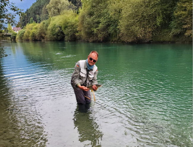 Mit viel Bewegung entlang des Flusses und zahlreichen Würfen konnten wir eine ordentliche Zahl an kleineren Äschen und Forellen überlisten. Besonders spannend wurde es, als wir gleich zu Beginn nach wenigen Würfen eine Marmorata-Forelle zum Anbiss bewegen konnten – ein echtes Highlight des Tages.