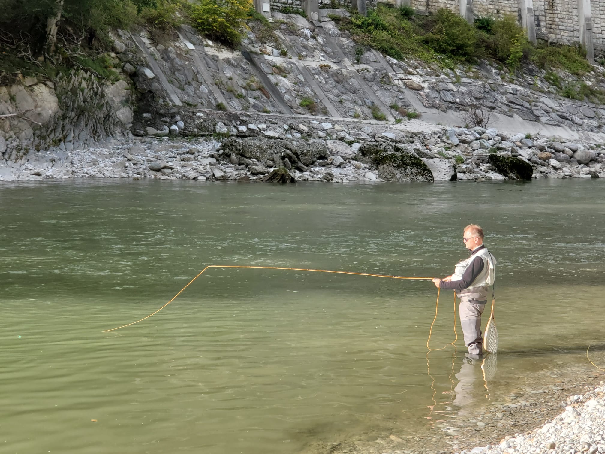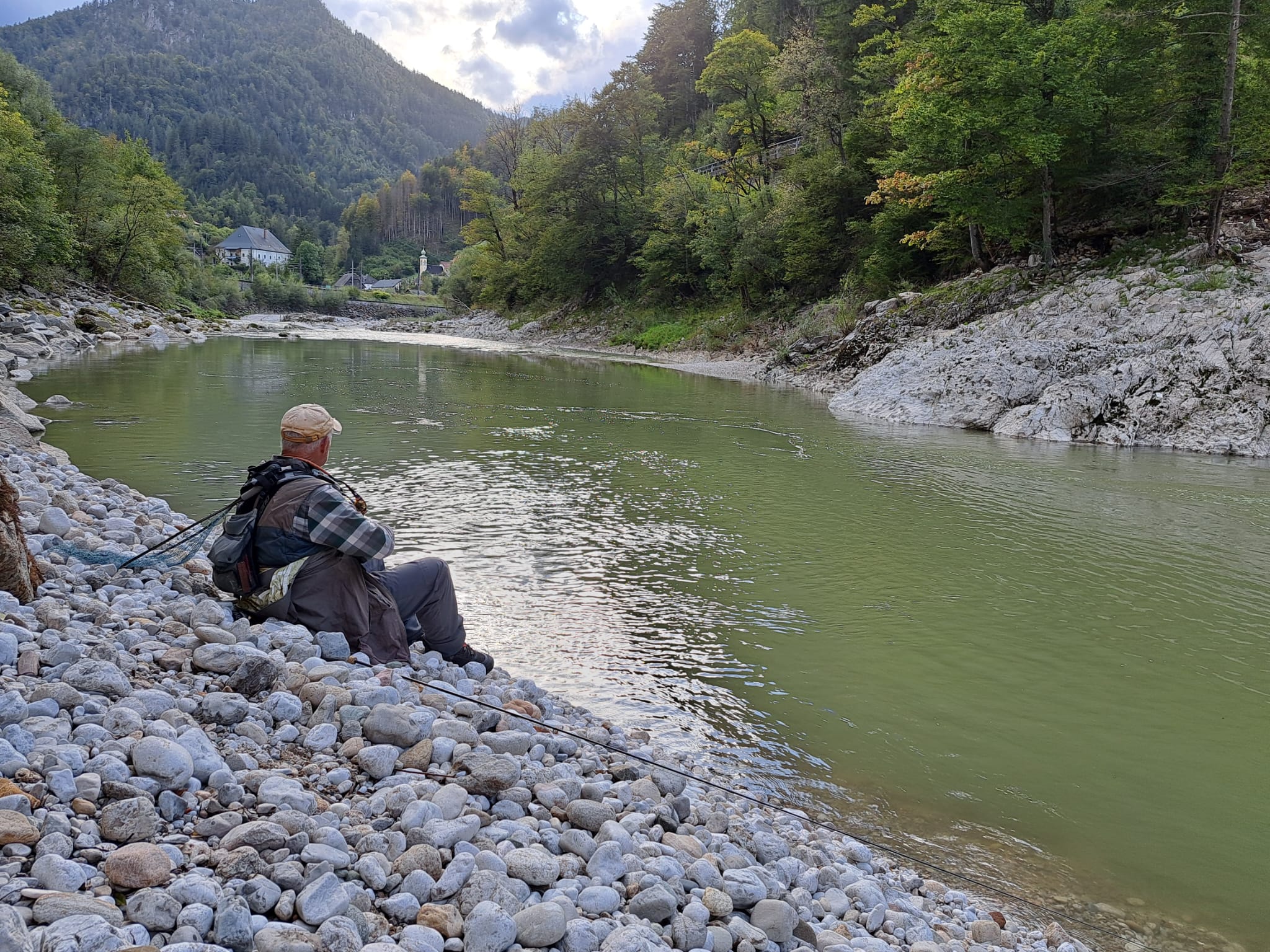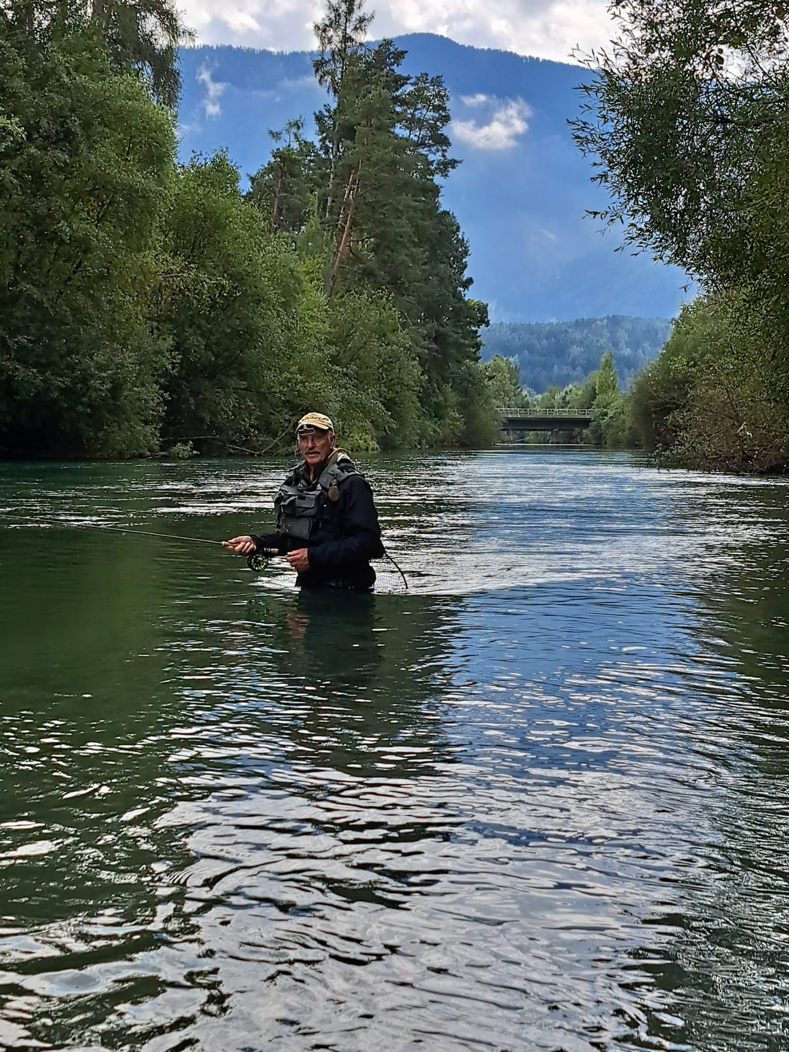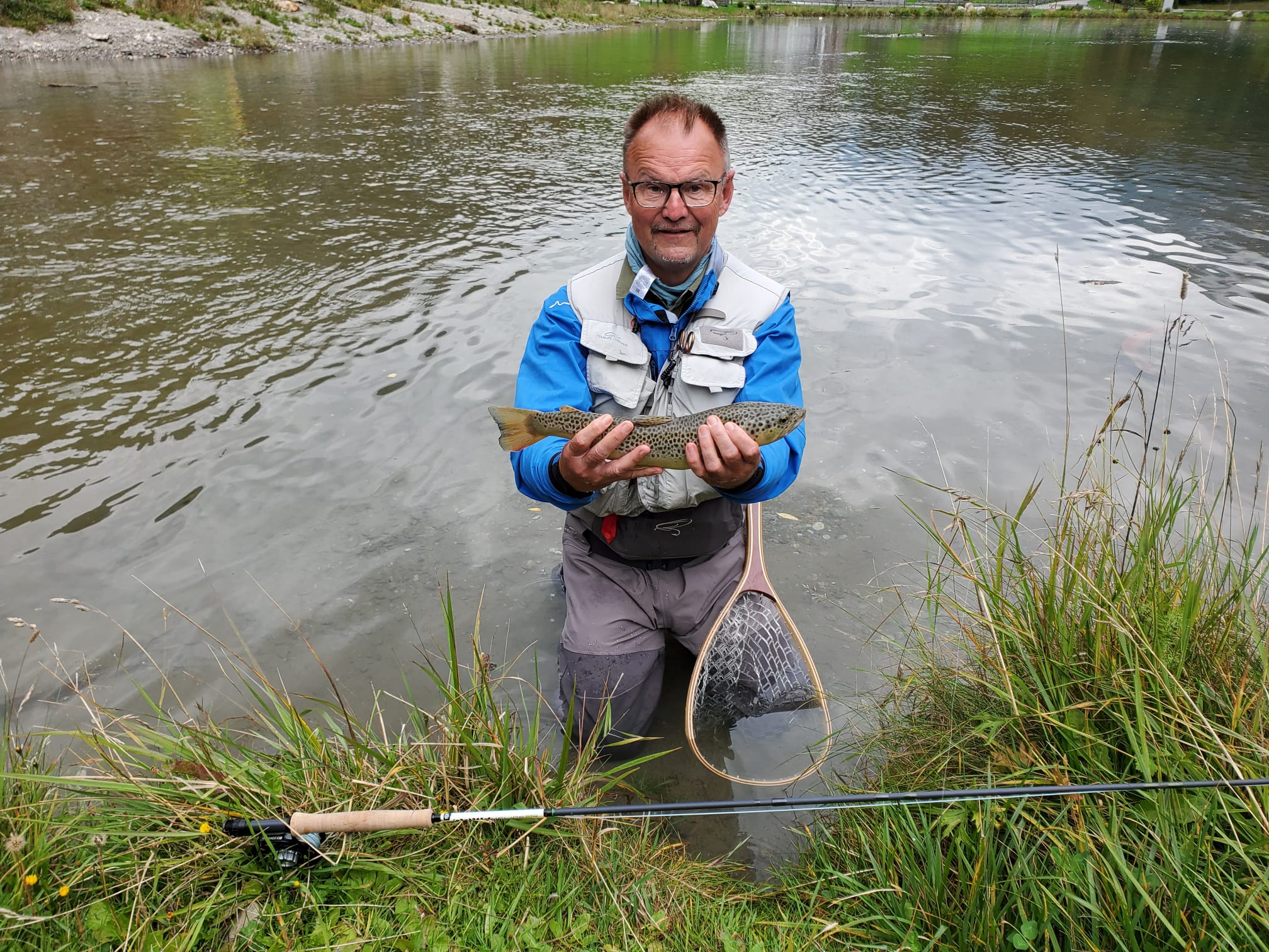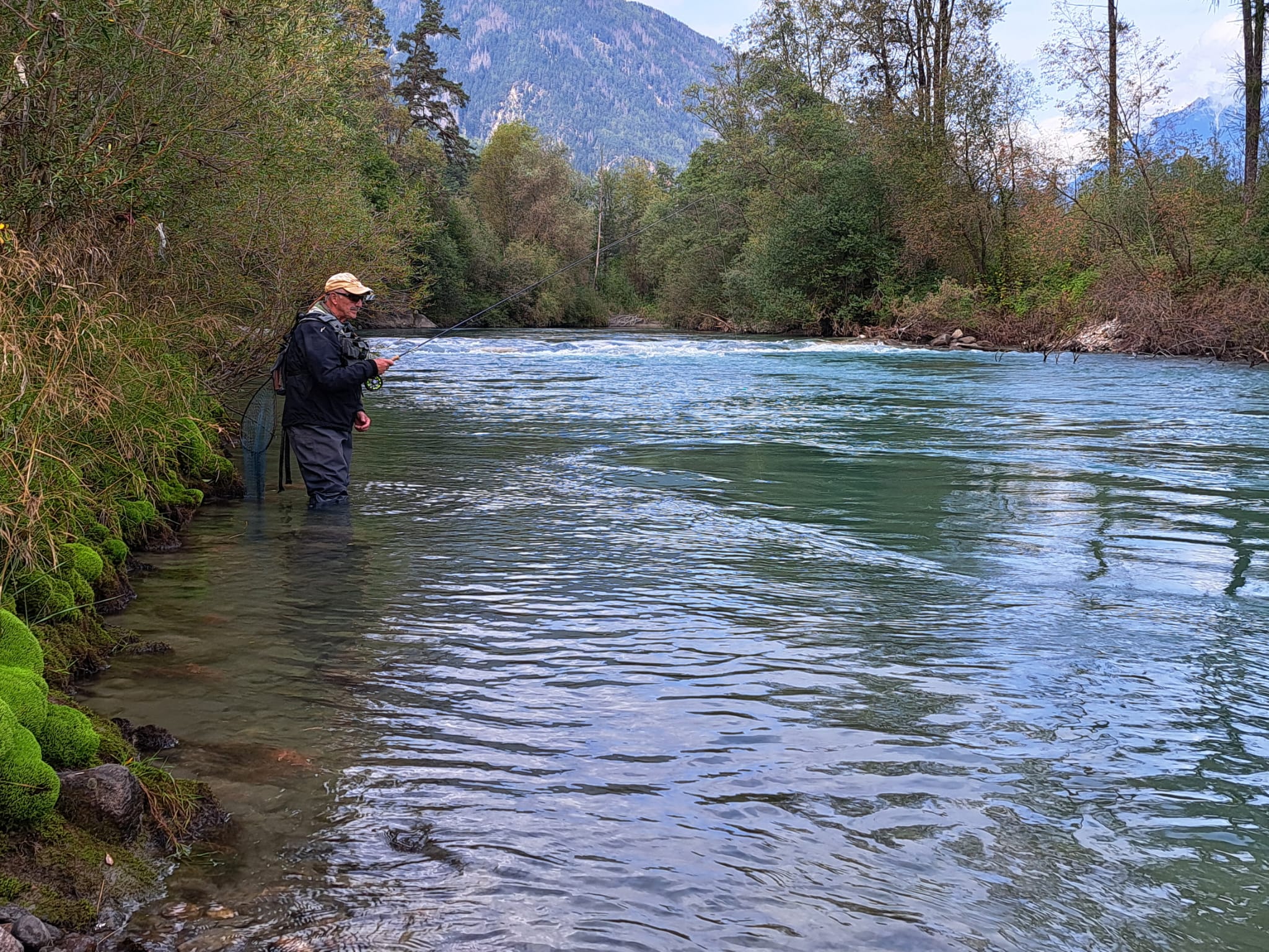 Trotz des durchwachsenen Wetters empfing uns dort eine atemberaubende Bergkulisse und kristallklares Wasser. Schon beim ersten Blick entdeckten wir prächtige Äschen und Saiblinge – ein Erlebnis, das sofort für Begeisterung sorgte.