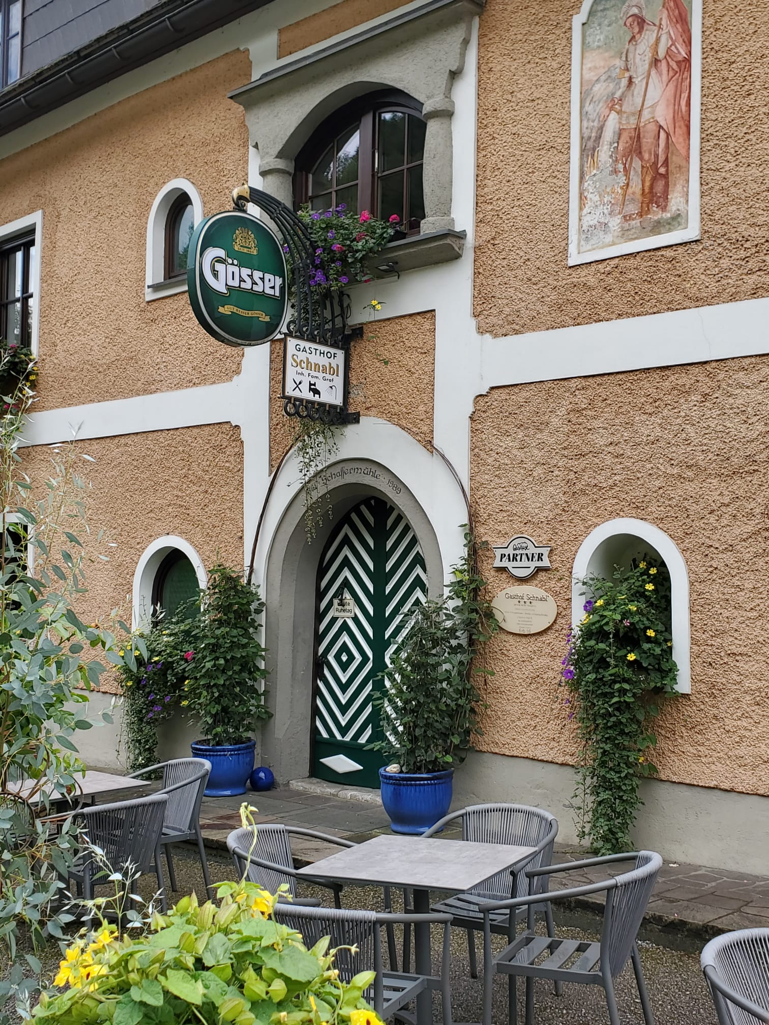 Wir sind nun in Österreich angekommen – der Weg von Wengen in Südtirol hierher war ein gutesStück, ca. 350 Kilometer quer durch die Alpen, also gut vier Stunden Fahrt. Nach einigen Unklarheiten mit unserer ursprünglich gebuchten Unterkunft haben wir uns schließlich im Gasthof Schnabl eingerichtet, einem gemütlichen Landgasthof in der Steiermark.