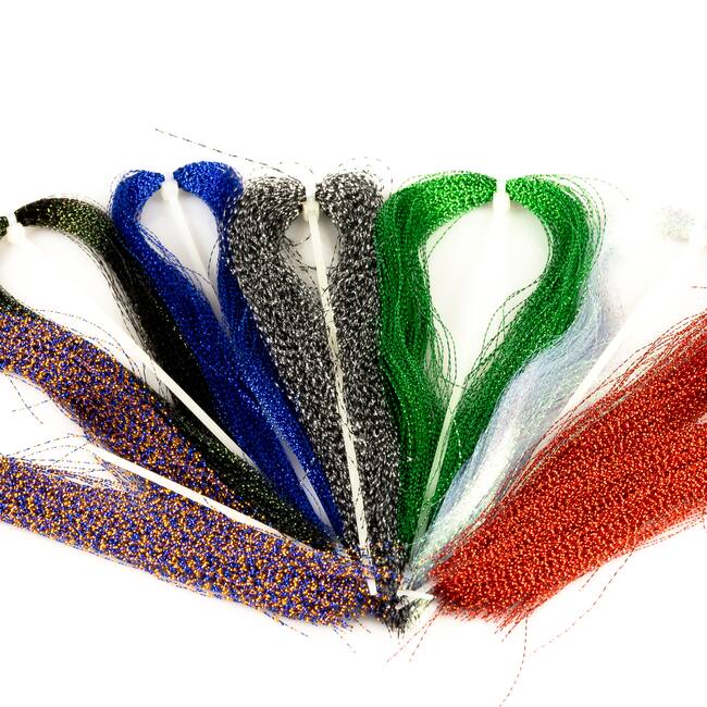 Feiner, gewellter, irisierender Kunststoffstrang mit außergewöhnlichem Lichtbrechungsvermögen. Verwenden Sie es bei Streamerfliegen für Hecht und Forelle und binden kleine Mengen in Lachs- und Meerforellenfliegen ein, um die Reizwirkung für den Fisch zu erhöhen.