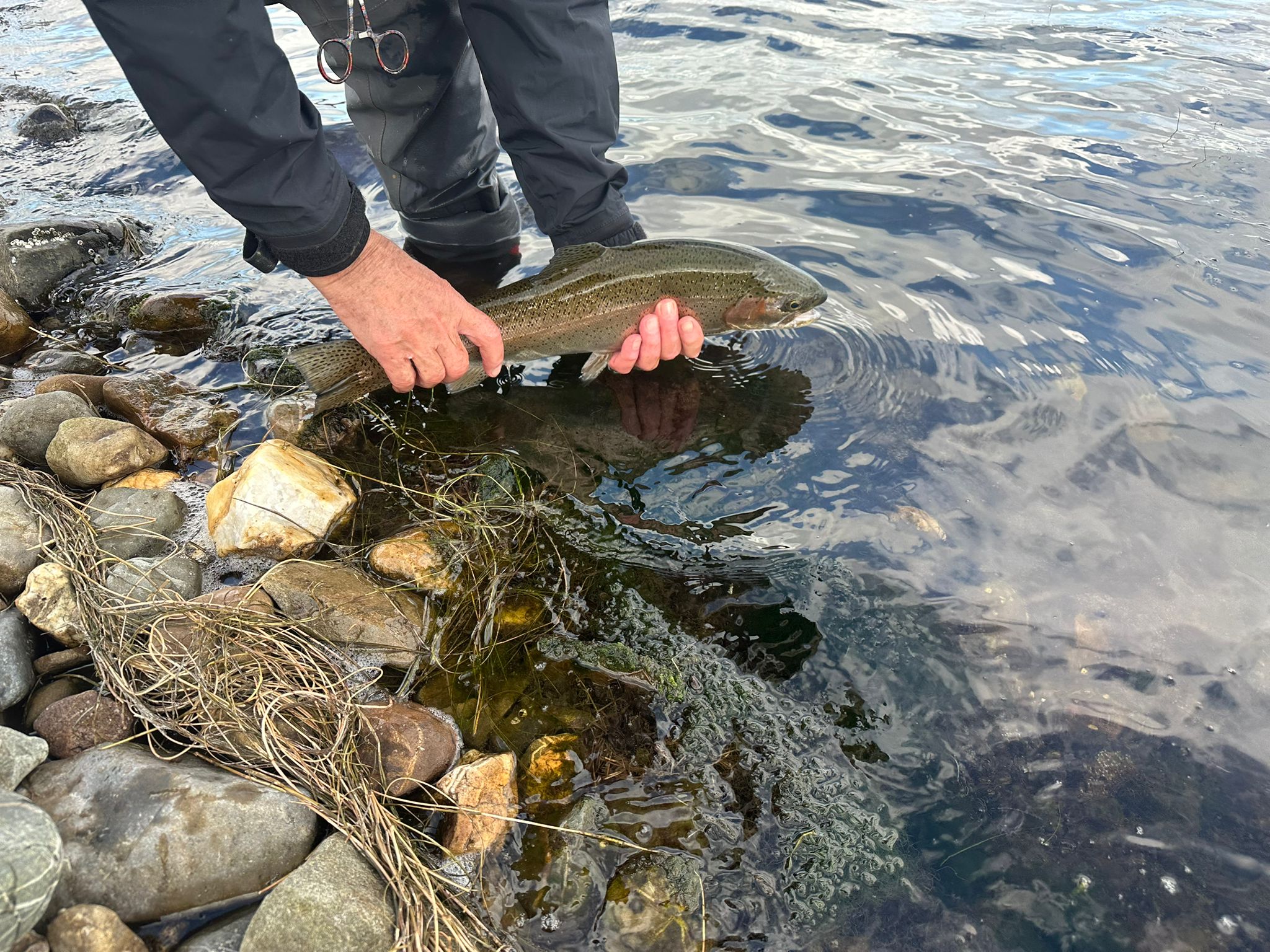 Kampfesstarke Regenbogenforelle mit 1,5kg – gutes Wetter, viele Kraut- & Algenreste machen das Angeln nicht leichter.“